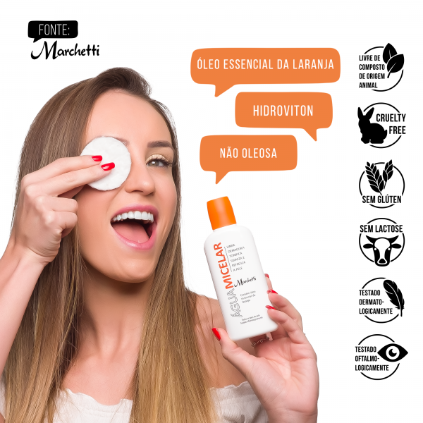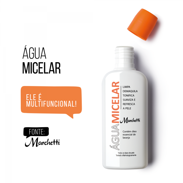 Água Micelar Marchetti é um produto sem enxague, multifuncional que limpa, demaquila, suaviza, purifica, tonifica, reequilibra o PH da pele e refresca!