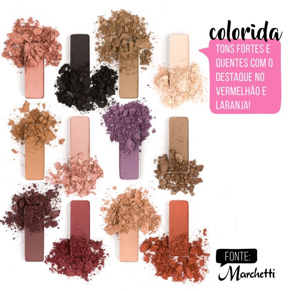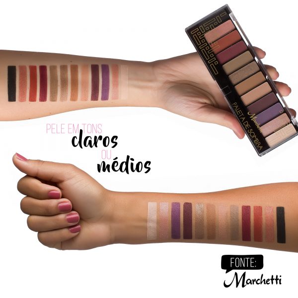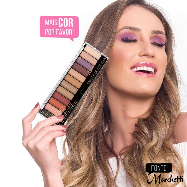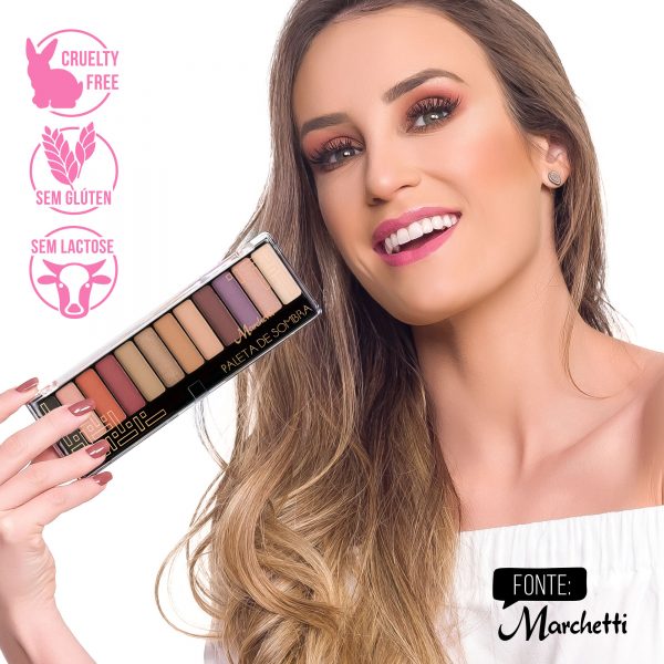 As Paletas de Sombras Marchetti contempla 12 cores de sombras entre opacas, metalizadas e mega brilhosas.