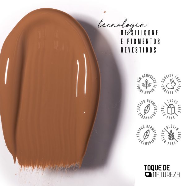 Base líquida facial Toque de Natureza com formulação ultra moderna à base de silicones e pigmentos revestidos que proporcionam alta cobertura com aspecto leve e uniforme, sem pesar, craquelar ou deixar oleosa.